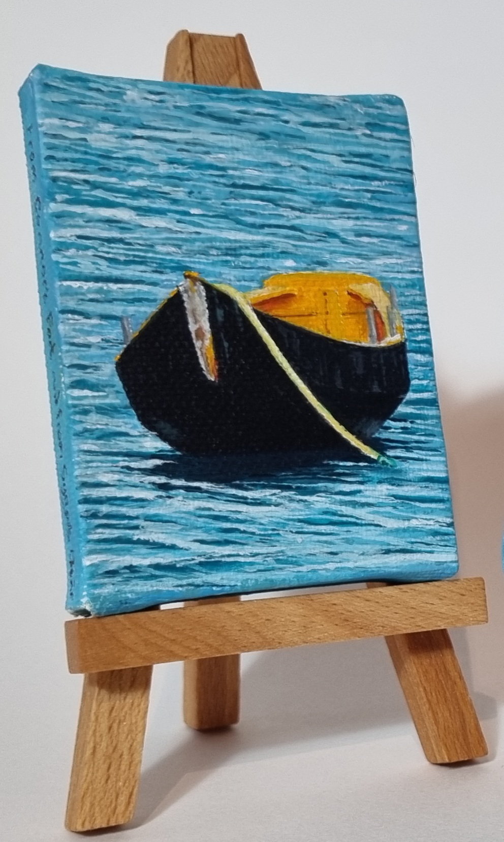 - Miniature Easels are fun to work with. They are readily available in good Art Shops or on the Internet. There are lots of ways to paint with them. In this exercise I tried to paint this Currach (Old Irish Boat from the West Coast, made from wood and animal hides) in such a way that you can move each easel to create a different perspective every now and then. Not that you would ever get bored looking at an authentic Irish Currach! This is one I seen in a bay when I was visiting Inis Mor which is the largest of the Arran Islands located off the west coast of Ireland.