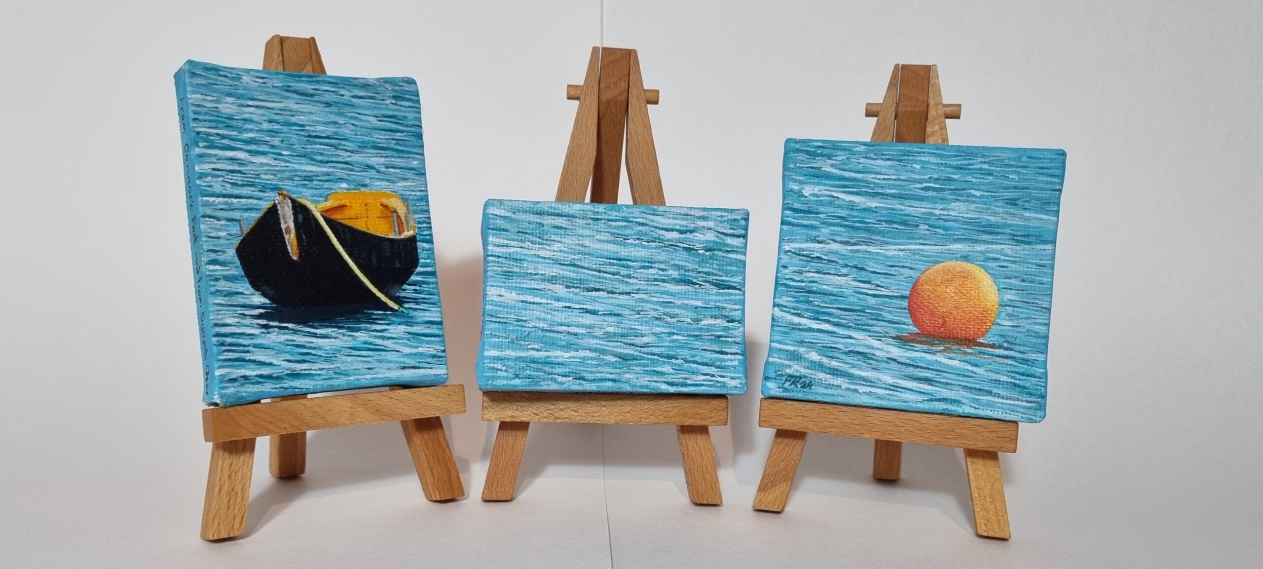 - I used Acrylic Gesso to even out the surface of the easels, two coats were enough to get them smooth enough to work with. Then I ‘Stretched’ the distance between the boat and the buoy and used the small easel to fill the area that I created. Next, I mapped out the scene in pencil on the three easels. (Leave plenty of time for the Gesso to dry before working on the easels) Then I did an underpainting, at which stage I changed the colour of the water to contrast better with the colours in the Currach and the buoy. I then did a second more detailed over paint before finishing with the details. This was a great little project and there must be Thousands of other ideas that would work just as well, finding the one that you like best is half the challenge!