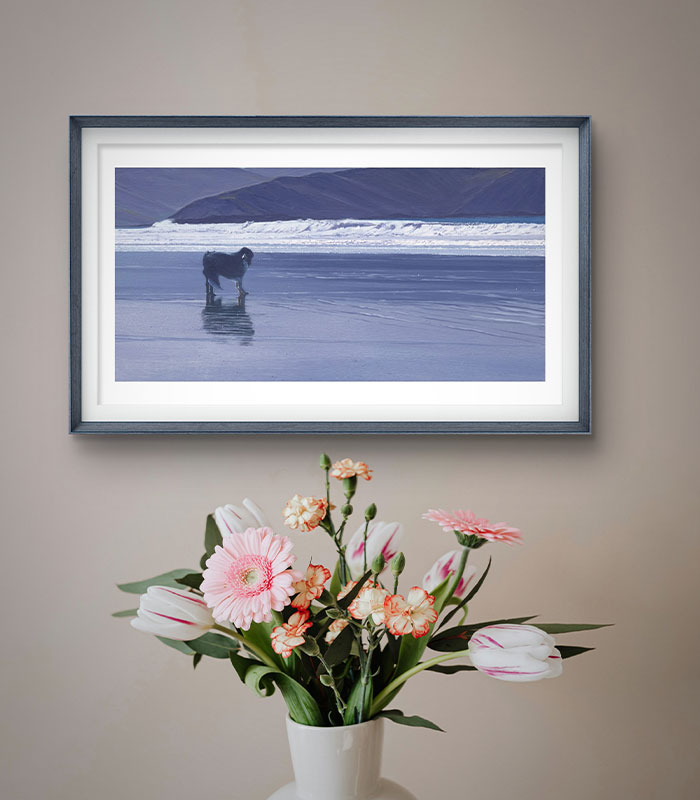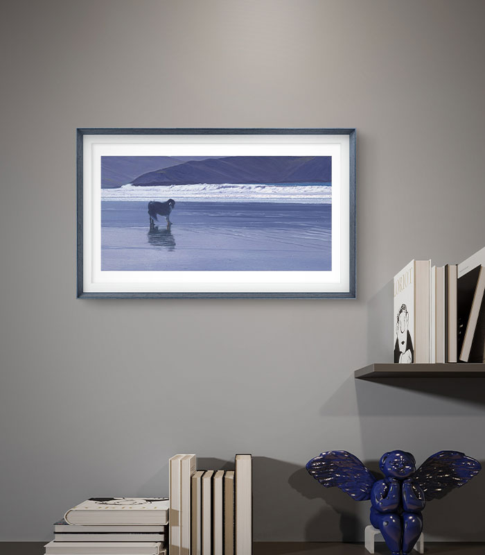 This is Print 2 from a set of 3 prints taken from an original oil painting, On the Beach. This is a study a dog on Inch Beach co Kerry Ireland. In this print the lone dog is offset to the left. Printed using the Glclee process on high quality fine art Archival paper. It is available to purchase individually or at a discounted rate for the set of 3