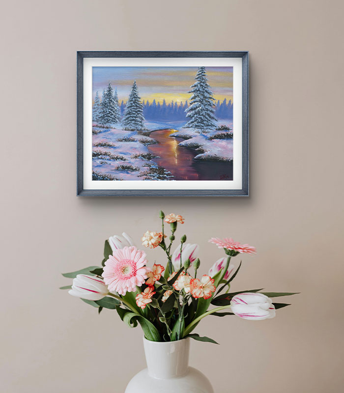 ‘Snow Study’ is an original oil painting on board featuring a magical winter scene with lots of colour hues and tones